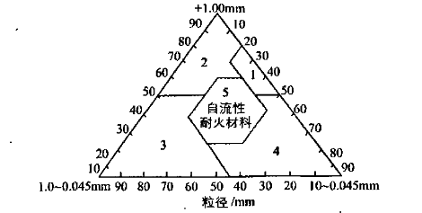 自流澆注料是根據(jù)流變學(xué)原理開發(fā)而成的。是一種屈服值較低,并具有一定塑性粘度的粘塑性材料。因此它要求具有合適的粒度組成,骨料與基質(zhì)的比例要適當(dāng)。如圖2所示。