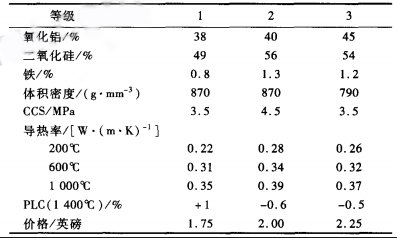 表2列出了3種隔熱磚類型。3類磚氧化鋁含量高,鐵含量低,密度小,看起來是最好的磚。1類和2類磚含量僅差2%,密度相同,1類磚導(dǎo)熱性較低。1類磚的PLC為+1%。