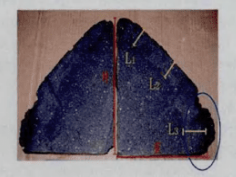 氣化爐緊急停車或發生操作故障時,爐溫急劇變化,也是向火面磚產生裂紋的主要原因,這可能導致由于熱應力而引起向火面磚出現大面積剝落,厚度可達5~30mm不等(見圖4)。隨著裂紋的產生和爐渣的滲透,在耐火材料表面形成滲透層,由于滲透層在膨脹系數等諸多理化性能與原耐火材料存在差異,在渣滲透帶和未滲透層之間也形成應力,隨著溫度的變化,會出現整體剝落。