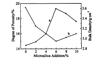 圖8 硅微粉加入量與澆注料氣孔率(a)及體積密度(b)的關系