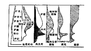 高爐在冶煉過程中,耐火材料的使用條件是很苛刻的,要承受爐內(nèi)溫度變化造成的熱沖擊,爐料和高溫氣流沖刷引起的內(nèi)襯磨損,氣體(CO2、O2和H2O)的氧化作用,鐵水、堿金屬、貴金屬(Zn和Pb)和渣的侵蝕等,各種損毀作用見圖1。