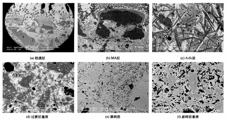 (a) MA層。如圖1(b)所示,厚度約0.8mm。該層中的剛玉顆粒被嚴重侵蝕,并在顆粒邊緣生成了一層MA;顆粒內部的Al203則反應生成大量的MA顆粒,這些顆粒分布于C2AS、CAS2等鈣鋁硅酸鹽低熔點相間。基質已與渣中成分完全反應,生成了大量的鈣鋁硅酸鹽低熔點相。