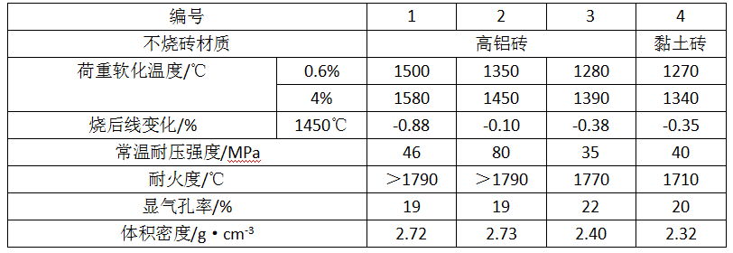 表1-1為硫酸鋁和水泥不燒磚的性能。編號1為硫酸鋁不燒磚,其耐火骨料和粉料分別為二級和一級礬土熟料制成;編號2用一級礬土熟料制作耐火骨料和粉料,用CA-70水泥作結合劑;編號3和編號4則用CA-50水泥作結合劑,耐火骨料分別為三級礬土熟料和一級黏土熟料,耐火粉料不燒磚應自然養護3天,水泥不燒磚初凝后應在潮濕環境中即淋水養護3天,然后送去烘干或直接筑爐。