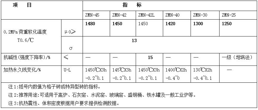 為磷酸鹽浸漬磚,ZMN-30、ZMN-25為耐堿粘土磚。