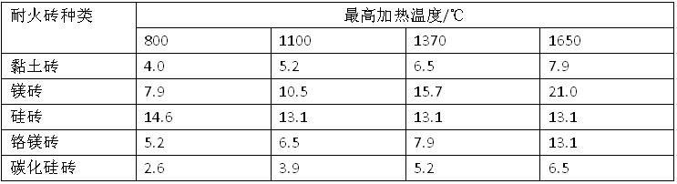 在耐火磚砌體結(jié)構(gòu)中膨脹縫的留設(shè)主要有直線形、折線形和端部集中留設(shè)等形式。一般來講,對于相對移動量小、爐膛溫度和爐壓不高的耐火磚墻體,多采用直線形膨脹縫。否則,宜用折線形膨脹縫。對于一些結(jié)構(gòu)尺寸和爐膛跨度較小,總計算膨脹量不大的耐火磚墻體,也可采用端部幾種留設(shè)膨脹縫的結(jié)構(gòu)。以下是幾種耐火磚的每米膨脹縫設(shè)計尺寸(mm)。