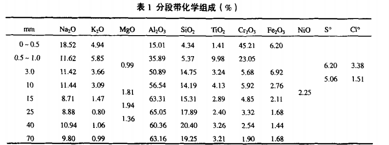 表1數(shù)據(jù)表明,高鋁磚表面吸人了3類組分:堿質(zhì)Na20和K20;酸性介質(zhì)S02/S03和氯和來自燒成帶的Cr203(蒸氣的凝固相)。堿質(zhì)Na20和K20一直擴(kuò)散到70mm段帶深度,依其0—70mm段濃度梯度推斷,它仍會向更深層帶滲透。Cr203也以氣態(tài)擴(kuò)散至很深部分,但以表層最集中。Fe203、NiO和S02/S03基本上富集于表面。