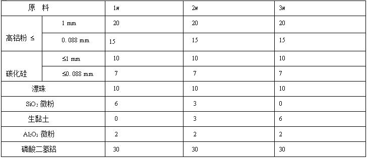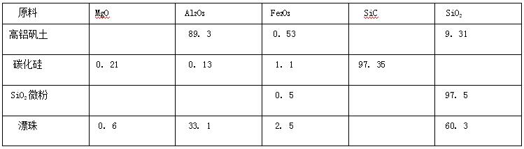 1:選用高鋁礬土顆粒與細粉、碳化硅顆粒與細粉及優質漂珠為主要原料 ,添加?瞎井a的 Elkem983 SiO2 微粉與生黏土 ,選用優質磷酸二氫鋁作為結合劑。主要原料的化學組成如表 1所示。