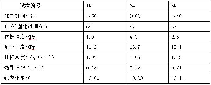 110 ℃ 24 h干燥后試樣的檢測結果如表 3所示。從中可以看出 , 2#試樣的綜合性能最好 ,不僅強度較高 ,而且施工、凝固時間也能夠滿足施工的要求 ,熱導率與輕質磚相近 ,線變化呈微收縮。因此 , 2#試樣能夠滿足要求 ,可以作為熱風爐管道樹脂灌漿料。