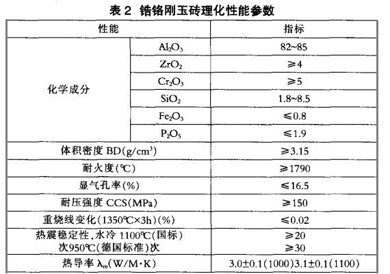 高強致密鋯鉻剛玉磚,是由剛玉、鋯質(zhì)材料、鉻質(zhì)材料。加入結(jié)合劑制成。剛玉為電熔致密 剛玉,該高強度致密鋯鉻剛玉磚,強度高、熱震穩(wěn)定性及抗渣浸蝕性能好,且耐高溫 。具有耐火度高、強度大、熱震穩(wěn)定性好、抗侵蝕能力強的特點,使用中耐沖刷,耐磨損,抗侵蝕,抗結(jié)構(gòu)剝落。屬中性偏酸性耐火材料,高溫下對酸性物質(zhì)的侵蝕抵抗性強 。其理化指標(biāo)見表 2。