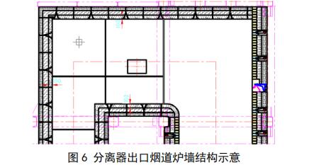 該部分處于分離器之后,工作溫度 900℃左右。從旋風 分離器出來的攜帶部分固體粒子的氣流速度較高,對連接煙 道會造成沖刷磨損,對耐火材料要求有較好的抗磨損性能及抗熱震性能,防止脫落。耐火層材料應采用高強度耐磨耐火澆注料如圖 6。