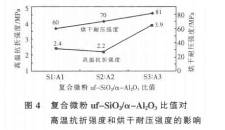 3.4 復(fù)合微粉中 uf-SiO2 和 α-Al2O3 的比例對高溫抗折強度和烘干耐壓強度的影響