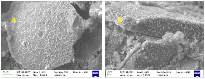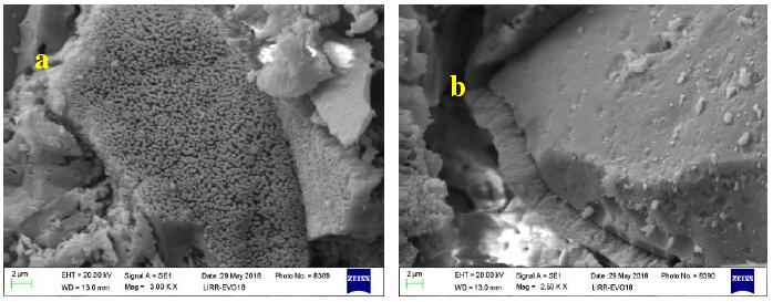 圖2是氧化250h試樣的顯微結構照片。圖2a是SiC細粉被氧化形成的一簇一簇的SiO2,像是被氣體均勻的蝕刻了一樣,氧化膜不完整,呈孤島狀分布。圖2b是0.3mm的SiC粒子表面生成了約4μm的氧化層,對應體積膨脹最大可能與骨料發生氧化有直接關系。該階段水泥的水化已經完成,結合水排出對水蒸氣滲入的阻力消失,主要反應為SiC的氧化。反應速度可能處于化學反應控制階段。