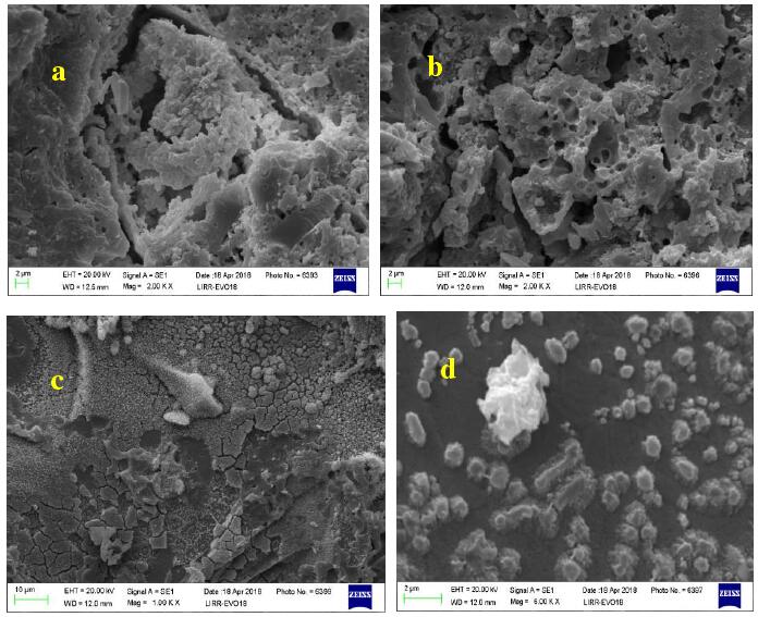 氧化50h該階段的主要反應包括水泥的水化失去結合水合SiC在水蒸氣條件下的氧化。下圖中三角形殼狀物質是一顆水泥粒子,其內部柱狀產物的分析結果為:AL2O3約21.45%,SiO2約52.12%,CaO約26.43%。推測是在水泥位置生成的鈣長石。下圖b 示出了水泥水化排出結合水留下的氣孔,和氧化后氣孔率略有增加有關。圖C示出了水泥水化產物的微裂紋,可以緩解氧化產物SiO2析晶和體積膨脹引發的結構應力。圖d示出了SiC離子表面生成的富SiO2玻璃相,含少量AL2O3,有融合跡象,但不明顯。試樣300h后仍然存在一定量的剛玉相。這是因為AL2O3在基質中的分布位置和狀態影響了氧化產物玻璃相的成分,改變了其熔點和粘度,使其鋪展性欠佳,導致氧化產物對顆粒的保護作用受限。