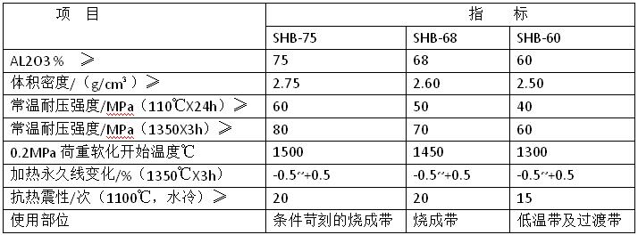 活性石灰回轉窯用不燒磷酸鹽磚按使用部位、使用條件以及理化指標分為SHB-75、SHB-68和SHB-60三個牌號,牌號中S、H、B分別為“石灰”“回轉窯”“不燒”的首個漢字的漢語拼音首字母,阿拉伯數字為三氧化二鋁的質量百分數。