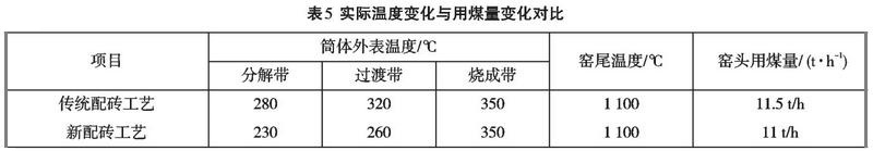 新配磚工藝將分解帶和過渡帶約47 m傳統(tǒng)耐火磚改為低導(dǎo)熱多層復(fù)合莫來石磚,對應(yīng)部位筒體外表溫度下降50〜80℃,有效地降低了筒體外表散熱能耗損失,實際效果見表5。本次優(yōu)化還帶來了另外兩個效果:一是因為低導(dǎo)熱多層復(fù)合莫來石磚的密度比原莫來石磚輕,在一定程度上減輕了窯體的自重,為增加物料負荷騰出了一定空間;二是改善了二檔輪帶與托輪運行環(huán)境二檔部位因窯筒體熱輻射強度大,輪帶與托輪一直處于高溫環(huán)境下運行,對托輪瓦與輪帶的安全運行有一定影響。在使用低導(dǎo)熱多層復(fù)合莫來石磚后二檔以后窯筒體表面溫度整體下降,改善了相應(yīng)部位設(shè)備的運行環(huán)境。