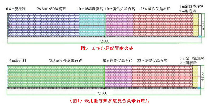 為了有效地減少筒體表面散熱,選用低導(dǎo)熱多層復(fù)合莫來石磚替代了分解帶和過渡帶47 m的硅莫磚,不僅降低了相應(yīng)部位筒體表面的散熱,還減輕了窯體的自重改善了二檔輪帶與托輪運行環(huán)境。值得注意的是:擋磚圈位置應(yīng)砌筑不少于兩環(huán)耐壓強度高的耐火磚,以防止低導(dǎo)熱多層復(fù)合莫來石磚受擠壓應(yīng)力變化造成低導(dǎo)熱層與保溫層受損。