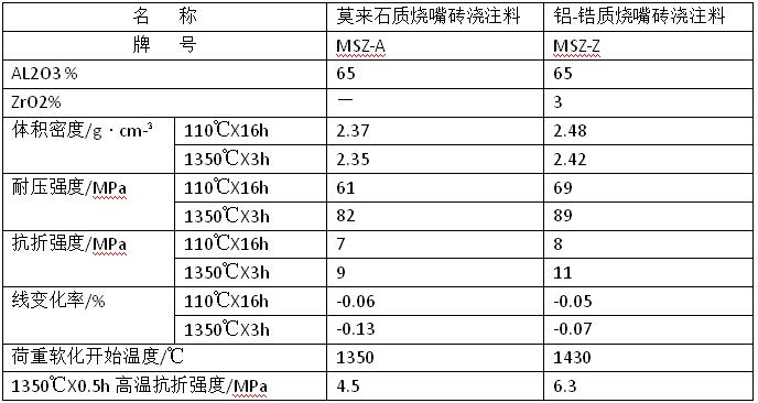 蓄熱式加熱爐用燒嘴磚原材料的選擇較為關(guān)鍵。骨料應(yīng)選擇煅燒充分的二級高鋁熟料、莫來石等原料,一般不應(yīng)選擇熱膨脹系數(shù)較大的剛玉原料。細粉部分應(yīng)選擇剛玉細粉、氧化鋁微 粉、二氧化硅微粉、鋯英砂細粉等,采用Secar71水泥和ρ—AL2O3復(fù)合結(jié)合。表1為燒嘴 磚主要的理化指標。