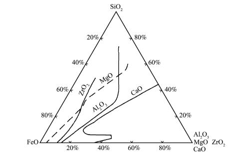 燒嘴磚材質(zhì)的選擇抗鐵硅渣侵蝕較好的材料,根據(jù)三相圖分析示出了1 500℃ 時各氧化物成分在FeO-SiO2渣中的溶解度。由圖看出CaO與鐵硅渣形成的液相區(qū)最大。因此 CaO 含量高的白云石材料抗鐵硅渣熔蝕性差,Cr2O3、ZrO2與鐵硅渣形成的液相區(qū)小,表明其抗鐵硅渣熔蝕性好。