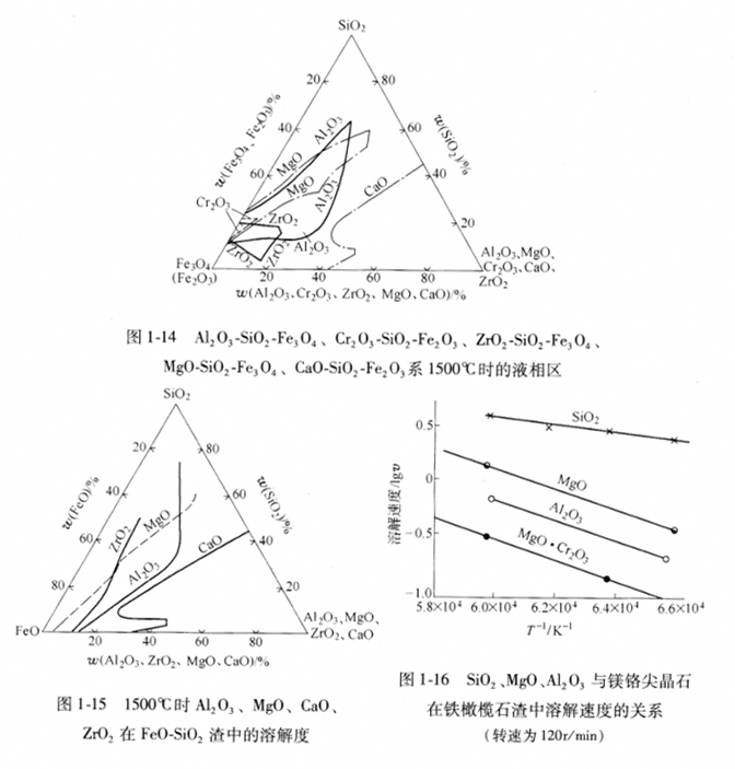 由于銅冶煉中耐火材料遇到的爐渣主要為Fe0-SiO2系渣,因此,了解各種耐火材料抵抗Fe0-SiO2渣侵蝕能力有助于合理選材。圖1-14給出了一些耐火氧化物與鐵硅系渣構成的三元系在1500℃的液相區。圖1-15示出了1500℃時 Al2O3、MgO、CaO、ZrO2等氧化物在FeO-SiO2渣中的溶解度。圖1-16則給出了 SiO2、Al2O3、MgO、MgO*Cr2O3在鐵橄欖石渣中的溶解速度。