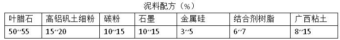 不燒炭質(zhì)塞頭磚的制備工藝泥料配比如下表1,混煉時(shí)間和順序 葉臘石→樹(shù)脂→高鋁礬土細(xì)粉→粘土→石墨→碳粉硅粉;炀10min即可使用。結(jié)合劑的選用曾在實(shí)驗(yàn)中選用水玻璃。由于水玻璃不能潤(rùn)濕石墨,而且對(duì)磚基嚴(yán)重地降低耐火度和高溫性能,因此被淘汰。在使用磷酸二氫鋁時(shí),發(fā)現(xiàn)與添加劑金屬Si粉有極大反應(yīng),在燜料過(guò)程中泥料早干,因此也被淘汰。只有使用酚醛樹(shù)脂,其為熱塑性,加入一定量固化劑,在混煉成型干燥中均為適宜,因此酚醛樹(shù)脂作為本材料結(jié)合劑。