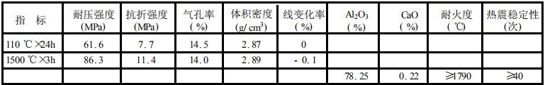 加熱爐、退火爐的正常使用溫度一般1250~1300 ℃,而燒嘴磚卻要承受1400~1500 ℃的高溫,燒嘴磚不僅需要足夠的高溫耐火性能及抗熱震性能 ,而且還應具備優良的抗高溫氣流沖刷與煙塵侵蝕的能力。因此 ,選用耐火性能優良的特級礬土熟料、三石礦物等為主要原料 , 以ρ-Al2O3 微粉、硅微粉為結合劑 ,同時選擇適宜的能改善澆注料良好施工性能的外加劑開展工作。按骨料∶粉料 = 65~75∶25~35 的比例進行配料試驗 ,首先將配合料在攪拌機內干混2~3分鐘 ,然后加入一定量的加有高效減水劑和外加劑的水溶液 ,濕混5~6分鐘,出料后在振動臺上成型為 40 ×40 ×160mm的條樣。經養護脫模后在烘箱中干燥 ,然后測定其 110 ℃×24h、1000 ℃×3h、1500 ℃×3h的理化性能 ,熱震穩定性采用1100 ℃水冷的測定方法,指標如下: