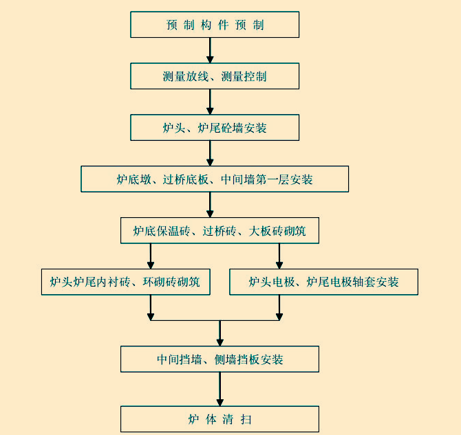 內串式石墨化陰極爐就其爐體砌筑工藝主要包括預制構件制作安裝和內襯砌筑兩大部分。其中:預制構件包括爐頭砼擋墻、爐尾砼擋墻、爐底墩、過橋底板、側墻擋板、中間擋墻等。內襯包括爐底隔熱磚、過橋磚、工作面大板磚、爐頭電極環砌磚、爐頭內襯磚、爐尾電極環砌磚、爐尾內襯等。