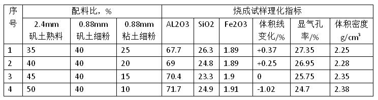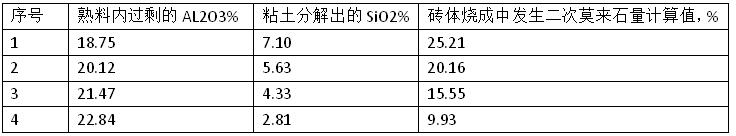 由以上實驗中可以看出,配料內粘土加入量愈多,燒成試樣愈易發生體積膨脹現象,顯氣孔率亦隨著粘土加入量增加而提高。這種現象是與莫來石剛玉熟料中過剩的AL2O3(即剛玉)在高溫下與粘土本身發生莫來石化后所分離出的SiO2產生二次莫來石化有關系的。在熟料中含有足夠多的過剩AL2O3時,加入粘土愈多,高溫下分離出的SiO2也愈多,因而形成的二次莫來石量也愈多,所以試樣體積膨脹也愈大,相應地,顯氣孔率也就愈高。在這個基礎上出發我們概略地將以上4個配料內在燒成中發生的二次莫來石化量計算如下表;