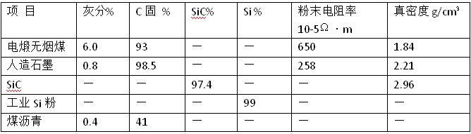 原料選用經1750-2000℃的電煅燒無煙煤此時已經半石墨化,石墨化呈度達15%~30%,它的結構致密、強度高。因此,以其作為主要原料。為提高導熱系數、耐堿性,改善成型性,加入少量人造石墨。另外加入SiC,原因在于SiC比碳優先氧化生成SiO。保護膜,覆蓋于表面,阻止制品進一步氧化,可提高炭制品的抗氧化性。為提高材料的質量,加入少量工業硅微粉,在焙燒成過程中,工業硅微粉與碳發生了Si(s)+C(s)→β-SiC(s)反應 ,生成物β-SiC,可賦予制品較高強度和耐磨性少量氣孔壁上未反應的Si與氣孔中的氧、氮發生4Si(s)+ 2N2 (g)+ O2 (g)→2Si2ON2 (s)反應 Si2ON2 為針狀結晶,使氣孔變細或封閉、堵塞氣孔,降低制品透氣度,阻止渣、鐵的滲透,提高耐氧化性。各種原料的理化性能見表1。