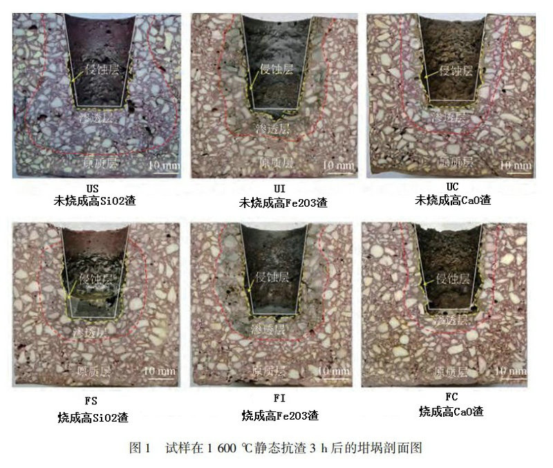鉻剛玉澆注料是重要的危廢焚燒爐爐襯材料之一,但危廢來源廣泛,成分復雜,導致爐渣的成分存在差異,從而影響爐襯的使用壽命。以鋁酸鈣水泥結合鉻剛玉澆注料為對象,選取了富含CaO、Fe2O3和SiO2的三種典型危廢爐渣,試驗了對鉻剛玉澆注料燒成前后的侵蝕/滲透行為影響。