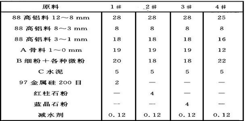 隨著熱工窯爐生產(chǎn)溫度的不斷提高,最高溫度區(qū)達(dá)1450℃以上,對(duì)耐火材料的高溫蠕變性能、熱震穩(wěn)定性能、荷重軟化溫度均提出了更高的要求。根據(jù)鍛造工廠(chǎng)使用熱工窯爐的破壞調(diào)查,對(duì)內(nèi)襯使用的耐火澆注料也越來(lái)越重視其高溫蠕變性能,即高溫條件下耐火澆注料不收縮不開(kāi)裂的能力,按照溫度條件對(duì)耐火澆注料性能的要求對(duì)產(chǎn)品進(jìn)行配方調(diào)整: