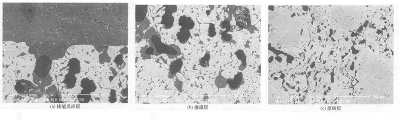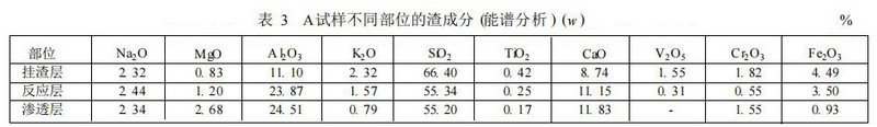 1 ( b)A試樣滲透層的SEM照片滲透層內(nèi)存在大量的玻璃相結(jié)構(gòu)比較疏松主要由熔渣沿著磚中晶粒間的通道向磚內(nèi)滲透和熔蝕造成。熔渣在滲透過程中與磚內(nèi)的Cr2O3 A l2O3接觸而造成其溶解導(dǎo)致渣內(nèi)Cr2O3A l2O3含量隨著縱向深度的增加而呈遞增趨勢(見表3)從而熔蝕了耐火材料壞了基質(zhì)同骨料間的結(jié)合造成其結(jié)構(gòu)疏松并且距熱面不同的距離會(huì)有不同量和成分的渣在氣孔和晶界通道內(nèi)停留形成不同的段帶,這些不同的段帶因熱膨脹系數(shù)的差異在溫度波動(dòng)時(shí)產(chǎn)生熱應(yīng)力導(dǎo)致磚的剝落而加速了其損壞。