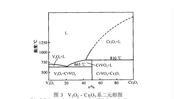 A試樣掛渣反應(yīng)層的XRD圖譜,可見在反應(yīng)層除了主晶相Cr2O3,還存在少量的混合型尖晶石和釩酸鉻相,混合型尖晶石相(MgFeTiOALCrFe2O3主要由熔渣內(nèi)的氧化鐵、氧化鎂和Cr2O3在距熱面較近的范圍內(nèi)反應(yīng)生成。能譜分析A試樣反應(yīng)層Cr2O3顆粒的化學(xué)組成為:Cr2O3 84.94% , V2O5 11.77% , A l2O3 3. 29%大部分V2O5固溶到Cr2O3 顆粒里這一點(diǎn)從原渣、掛渣層、反應(yīng)層和滲透層渣內(nèi)V2O5含量隨著滲入深度的增加急劇下降 (3)也可得以印證。圖3V2O5-Cr2O3 共存時(shí)的相圖V2O5的熔點(diǎn)僅670℃ Cr2O3共存時(shí)最低共熔溫度665℃,也就是說磚在使用過程中會(huì)不斷與石油焦分解產(chǎn)生的 V2O5接觸產(chǎn)生固溶可在非常低的溫度下形成液相從而導(dǎo)致Cr2O3 顆粒的熔蝕形成鋸齒狀的界面和反應(yīng)層的失強(qiáng)熔蝕到渣內(nèi)的Cr2O3在冷卻時(shí)又會(huì)同V2O5共同析晶生成釩酸鉻 (CrVO4 )即圖1 ( a)中所見的針狀物 (能譜分析針狀物的組成與釩酸鉻的理論組成相似 )。值得注意的是 , Al2O3V2O5共存時(shí)的最低共熔溫度僅640℃,V2O5接觸時(shí)也會(huì)導(dǎo)致它的熔蝕。