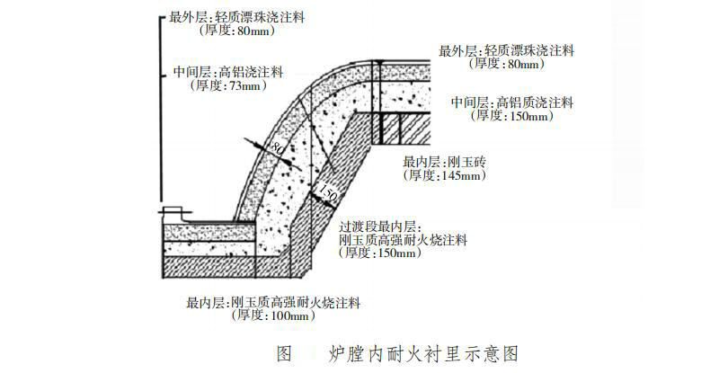 鋼殼體筒體段耐火襯里分3層(見圖)最外層為輕質漂珠澆注料襯里,厚度為80mm;最內層為剛玉磚,厚度為145mm;中間層為高鋁質澆注料,厚度為150mm,剛玉磚層與中間層的間隙為5mm。