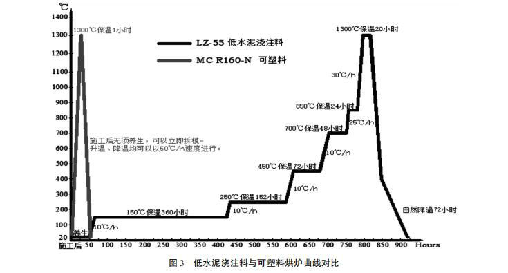 可塑料適合一年四季施工,在施工后無須養護,以立即升溫,烘爐升溫速度為50 ℃/h,24 h 即可達到生產操作所要求的爐溫,大大縮短了烘爐時間,減少了烘爐費用。而澆注料在施工后需要等待固化、養生、漫長的烘爐過程,且不適合在冬季施工,必須注意防凍。澆注料和可塑料的烘爐曲線對比見圖