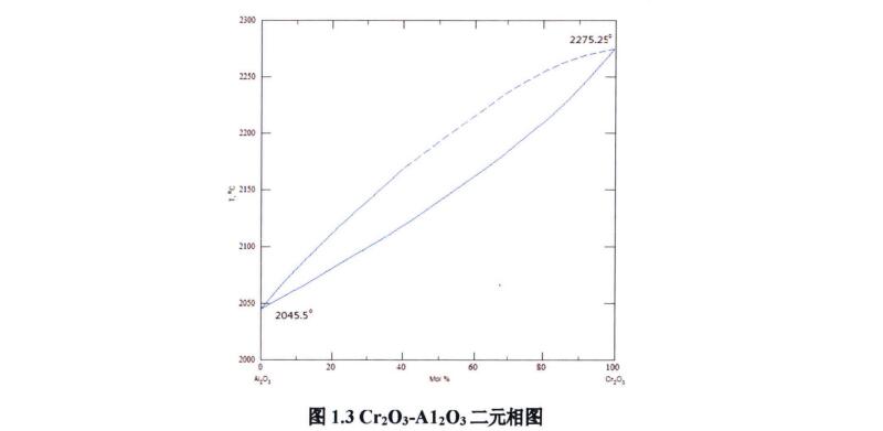 Cr203和AL203的晶體結(jié)構(gòu)相同,離子半徑相差13.7%,因此,高溫下Cr203和AL203可以形成無限固溶體,如圖1.3所示。從液一固相線看,隨著Cr203含量的增加,開始出現(xiàn)液相的溫度也隨之升高,因此在A1203中添加適量的Cr203能顯著改善剛玉系耐火材料力學(xué)性能和高溫使用性能。
