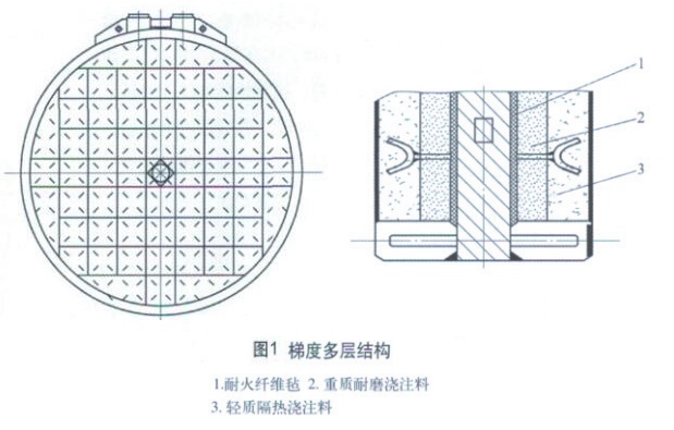 閥板一般采用單層重質不定型耐火澆注料覆蓋(如圖1所示),可以耐高溫,耐熱風沖刷,但重質耐火澆注料熱導率高,隔熱效果較差,故閥板需采用大量循環水冷降低金屬構件溫度。另一方面,循環水冷不利于不定型耐火澆注料的高溫燒結而陶瓷化結合,導致耐火澆注料耐高溫性能較差。也有生產人員采用單層輕質隔熱耐火澆注料,有隔熱效果,但是耐熱風沖刷性能較差,產品壽命較短。單層覆蓋耐火澆注料結構單一,施工工藝簡單,但節水、節能、使用壽命及應用效果都較差,這是目前閥板存在的問題。