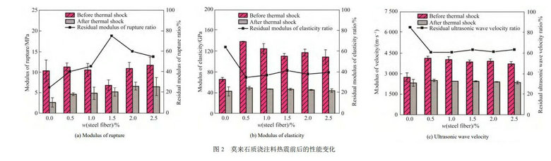 圖2為莫來石質澆注料熱震前后的性能變化。由圖2a可見,熱震后澆注料的抗折強度保持率呈現先增加后降低的變化規律,當鋼纖維加入量為1.5%時,熱震后抗折強度保持率達到最大,這表明鋼纖維的引入有助于提高材料的斷裂韌性,減緩熱震過程中內部缺陷的生成擴展,提升澆注料的抗熱震性,但過量鋼纖維可能會導致澆注料內部缺陷數量和尺寸增加,反而降低材料的抗熱震性。