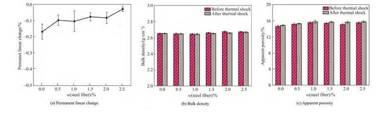 圖1為1200 ℃熱處理后不同鋼纖維加入量對莫來石質澆注料常規物理性能的影響。由圖1可見,隨著鋼纖維加入量的增加,澆注料線收縮率逐漸變小(見圖 1a)。這是因為鋼纖維的熱膨脹系數較大約為(12~14)×10–6 /℃,遠高于莫來石澆注料基體約為(4~6)×10–6 /℃,造成添加鋼纖維后的線變化率趨向于膨脹。同時,隨著鋼纖維加入量的增加,成型時所需加水量增加,雖然鋼纖維密度大于莫來石基體材料,但因鋼纖維加入量不大(最大量為2.5%),導致澆注料的體積密度隨鋼纖維添加變化較小,即體積密度在2.65~2.68 g/cm3,顯氣孔率在14.6%~15.5%波動變化。熱震后因材料內部裂紋的出現,結構變得疏松,表現為澆注料的 體積密度下降(見圖 1b),顯氣孔率增加(見圖 1c)