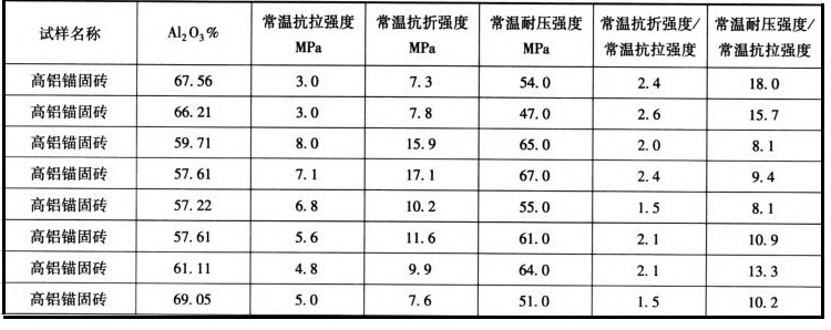 高鋁錨固磚作為高溫材料,其損壞機(jī)理主要是熱機(jī)械應(yīng)力。在實(shí)際應(yīng)用中,當(dāng)材料的局部壓應(yīng)力達(dá)到耐壓強(qiáng)度,或者局部拉應(yīng)力達(dá)到抗拉強(qiáng)度時(shí),裂紋就在此處最先形成,在熱應(yīng)力和殘余應(yīng)力的綜合作用下擴(kuò)展,最終造成高鋁錨固磚的開裂和剝落。 以下是實(shí)驗(yàn)測試各種不同的AL2O3含量的錨固磚抗拉強(qiáng)度。