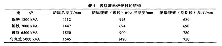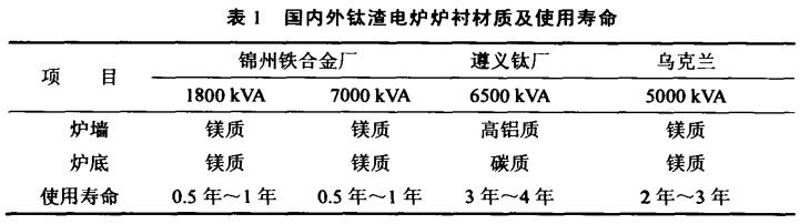 目前,鎂質耐火磚、高鋁質耐火磚和碳質耐火磚在鈦渣電爐上都有應用,鈦渣電爐爐體的大修周期最長的為3年~4年,短的只有半年,國內外鈦渣電爐主要材質及使用壽命見表。