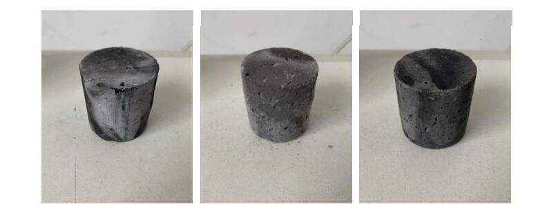 分析認(rèn)為,不同于純H2還原,在混合氣氛下,耐火材料的受損程度取決于還原反應(yīng)與滲碳反應(yīng)的共同作用,耐火材料中的Fe2O3會(huì)與H2和CO反應(yīng),被還原成FeO和單質(zhì)Fe,進(jìn)一步催化CO發(fā)生析碳反應(yīng)析出碳(2CO(g)→CO2(g)+C(s)),CO在制品表面及內(nèi)部(通過氣孔進(jìn)入)發(fā)生歧化反應(yīng),產(chǎn)生碳沉積,碳沉積伴隨大量的體積膨脹導(dǎo)致耐火材料的結(jié)構(gòu)受到嚴(yán)重破損,進(jìn)而嚴(yán)重影響到耐火材料的相關(guān)服役性能。這也是導(dǎo)致含CO還原氣氛下耐火材料性能下降更為明顯的主要原因。如圖所示,被還原后的高鋁澆注料試樣出現(xiàn)部分破損開裂的現(xiàn)象也證實(shí)了這一點(diǎn)。