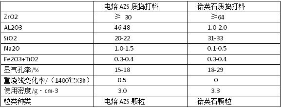 鋯質(zhì)骨料是鋯質(zhì)搗打料的骨架,對(duì)鋯質(zhì)搗打料的高溫物理性能起重要作用。目前常使用的玻璃窯爐池底鋯質(zhì)搗打料主要有兩種:一種是電熔AZS質(zhì)搗打料,一種是鋯英石質(zhì)搗打料。其理化指標(biāo)如下表。